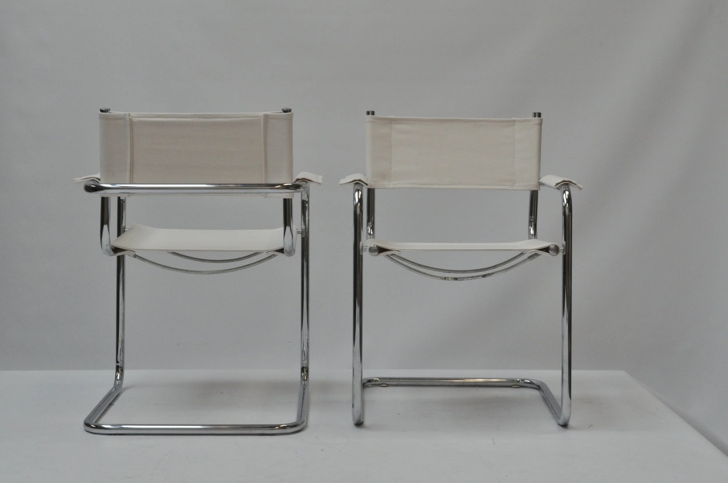 Oorspronkelijk waren de stoelen uitgevoerd in zwart tuigleer. Dit leer was echter volledig vergaan en gaf de stoelen een vrij zwaar en architecturaal karakter. Bij de herstoffering is bewust gekozen voor een andere benadering. In plaats van het oorspronkelijke materiaal te reconstrueren, zijn de stoelen opnieuw bekleed met Lino Coex, een Italiaans linnen van Chioccarello. Dit materiaal geeft de stoelen een lichter, zachter en meer tactiel karakter, terwijl de oorspronkelijke constructie behouden blijft.